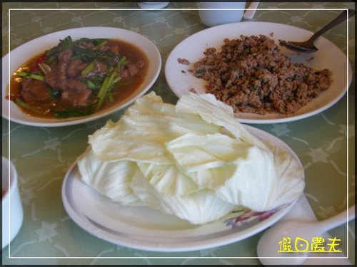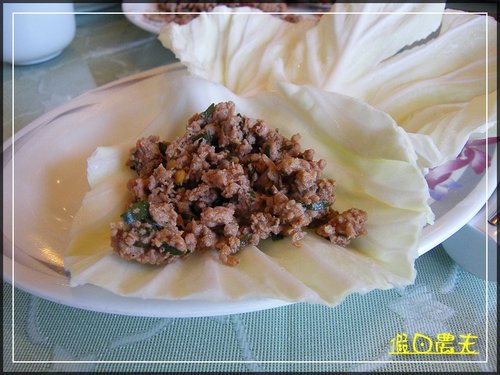 「錦灑」是將豬肉剁碎,加上雲南香料、薄荷、辣柳等醃製,上桌前一起下鍋爆香,再用高麗菜葉包著吃,拿來拌飯也很有味道